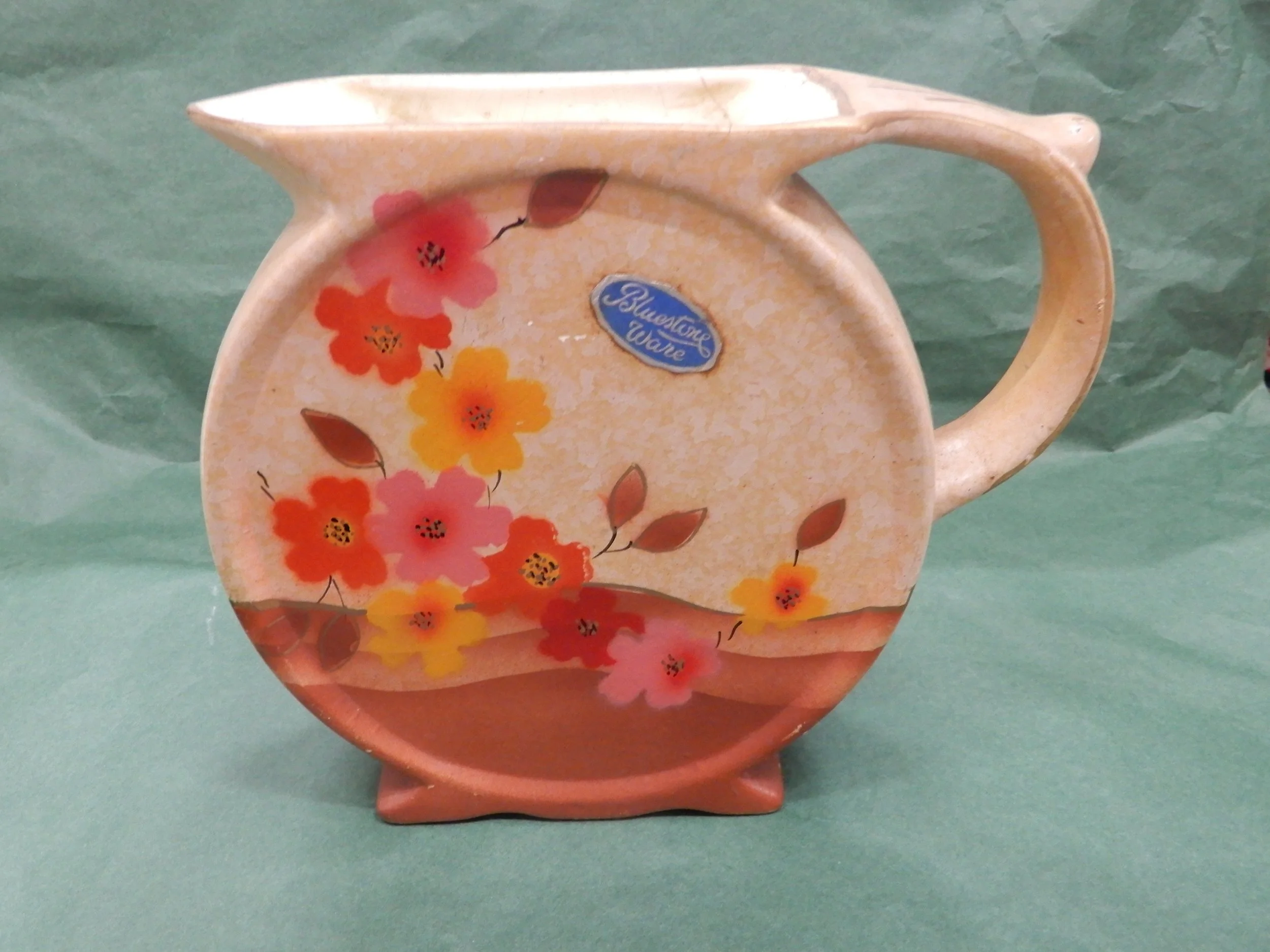 Winterton Bluestone ware jug 15cms high by 18cms spout to handle. Made in Longton- England Circ 1939-1941. Small crack in the inside glaze, not showing through. Note that the jug still has its blue ‘Bluestone’ sticker